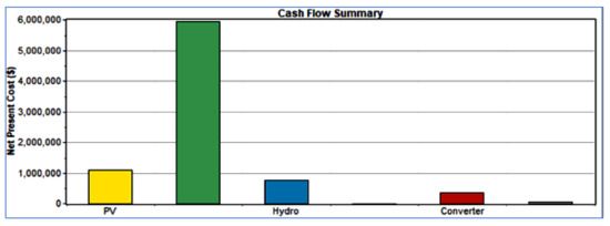 From Figure 8 above cash flow summary graph the net present cost of wind farm (green color) is more costly than that of PV (yellow color), micro-hydro (blue color) and converter (red color) but the cost of battery is lower than the remaining system components.