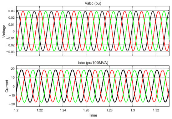 The output of the three different colors (black, green and red) shows the three-phase output voltage and current waveforms produced from inverter of the solar array. They are in-phase with each other having the same magnitude.