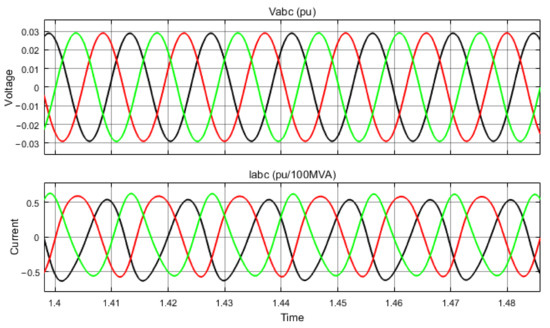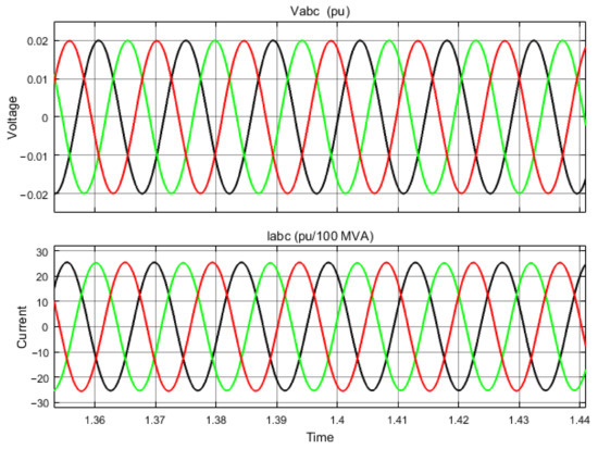 Figure 11 shows the output voltage and current generated by wind. The output of the wind generator is AC power, which means that wind speed or aerodynamic lift force turns on the wind turbine, which produces mechanical power, and the mechanical power (torque and angular speed) of the wind turbine drives the doubly fed induction generator (DFIG) as a result of an AC sinusoidal wave form being produced, which has an identical output in the magnitude of voltage, phase angle, and frequency for synchronization purposes. So, DFIG produces a three-phase 50 Hz AC output, and the transformer steps down the voltage to 400 V for residential applications. The current waveform is unbalanced. This is due to the random variation of wind speed throughout the whole time. As the unbalance is much more difficult, it does not have any effect on system synchronization or equipment damage.