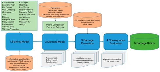 Here, M represents the material properties which includes wind uplift performance, debris impact resistance and resistance to rain intrusion. W represents the wind load acting on the components, which is a function of the wind speed, terrain and geometry of the building. R represents the properties of the rain, which is critical for determining the amount of rainwater intrusion and interior loss; C represents the cost of installation of individual components of the building used to determine the value of the building and repair cost. The framework and variables for the catastrophe model should be able to accommodate the variety of categories and sub-categories of elements of the building. The proposed framework runs as a five-step process as shown below in Figure 1. The five important steps [11,12,13,14,15,16,17] are: 1. Building Model 2. Demand Model 3. Damage Evaluation 4. Consequence Evaluation and 5. Damage Ratio evaluation. The main variables used in the models are listed in Table 1.