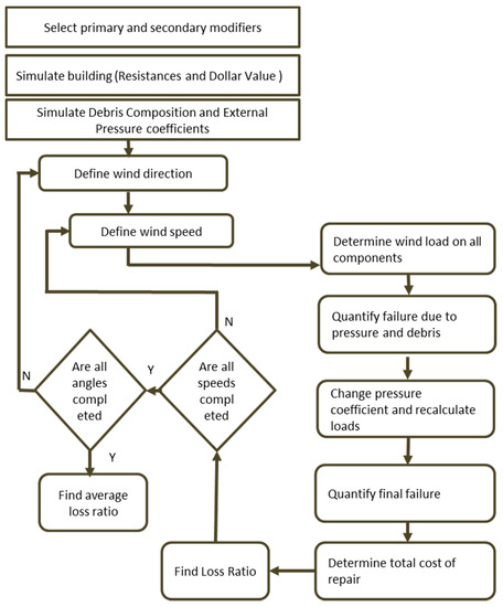 - Initial failure check: each component of the building is checked for failure for a given wind speed and wind direction. Any component that is failed is recorded. Dependency of the roof cover on the roof deck is considered in this check along with the dependency of the roof sheathing on roof-to-wall connections.