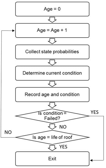 Algorithm to obtain the time-dependent condition [63,64,65] of roof using state probabilities and maximum service life of roof.