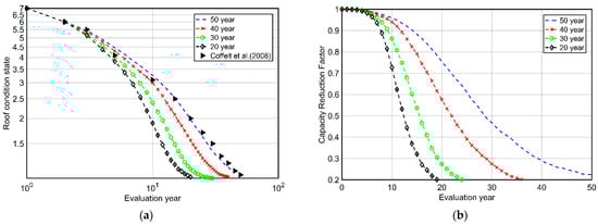 Research on roof aging [63,64,65] reports roof conditions as ordinal data from extensive condition assessment surveys of commercial roofs. Based on the data, researchers also report state transition probabilities of the condition (on a scale of 1 to 7, where 7 is excellent) of in-use commercial roofs. These probabilities specify the likelihood that the roof will remain or change its state in unit time. We use these probabilities to model the performance degradation with time. A Markovian approach is adopted by determining the state transition probability based on data collected on roofs of in-use buildings [64]. Firstly, a Monte Carlo (MC) simulation was carried out using the state transition probabilities for a roof with a service life of 50 years. Simulation results for the 50-year-old roof match well with the values provided in [64] as shown in Figure 4a (compare Coffelt et al., 2008, and the 50-year simulation result). In order to determine the state transition probabilities for other roof lifespans, such as 20, 30 and 40 years, a linear model was implemented to update the probabilities. Repeating the MC simulation for all the service lifespan cases (20, 30 and 40 years), we obtain the results shown in Figure 4a.