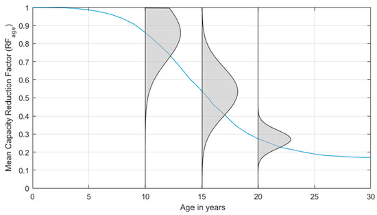 Mean Reduction Factor for capacity with respect to age in years for commercial roof cover with lifespan of 30 years. Distribution across the mean is shown at ages 10, 15 and 20 years.