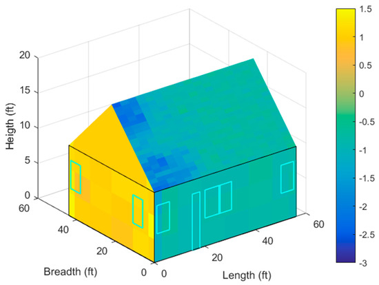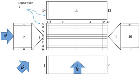 Here, is the height of the component, is the nominal height of the atmospheric boundary layer and is the power law exponent. Each region of the roof (as shown in Figure 7) or wall is assigned a mean pressure coefficient and the discretized elements of each region of the roof can each be assigned a pressure coefficient.