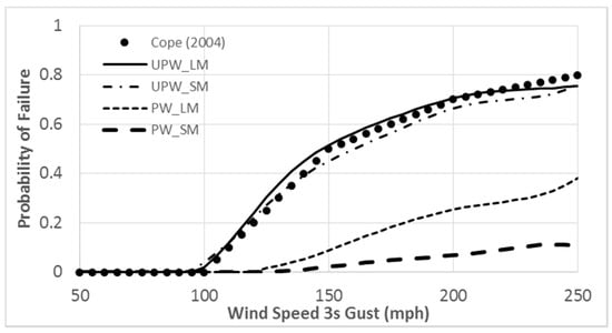 Probability of 3.5ft x5 ft unprotected window failure on a 44ftx10ft wall. Validated using the results of Cope, 2004. Also shown are the probability of failure of protected window in small missile and large missile environment. UPW—Unprotected window, PW—Protected Window, SM—Small-Missile Environment and LM—Large-Missile Environment.