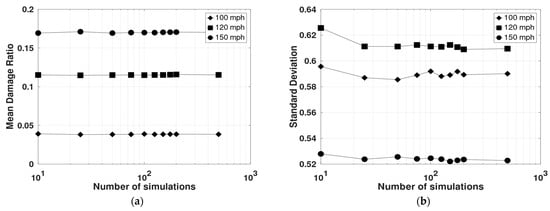 Convergence of simulations as observed from the (a) mean and (b) standard deviation of DR for a commercial building at various wind speeds.