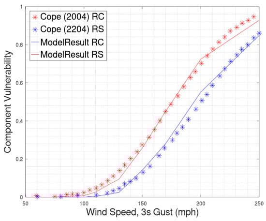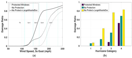 Descriptions of variables are available in the nomenclature table. The number of potential elements of debris is initially assigned. Then, the percentage of debris hitting the building is determined as a function of the wind speed. The debris that hits the building and target location on the building are randomly sampled. If any debris hits the window, the property of that debris is recorded. The ratio of momentum of the debris and the capacity of the protected window is calculated [71] for every element of debris that impacts the window. If the sum of the ratios for all the impacts is greater than one, then the window is marked as failed. The model is validated using the results from [10] as shown in Figure 8. Furthermore, the failure probability for protected and unprotected windows in two different environments is presented—a small-missile environment and a large-missile environment.