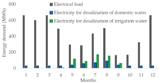 Monthly demands for electricity load and electricity for desalination of domestic and irrigation water supply.