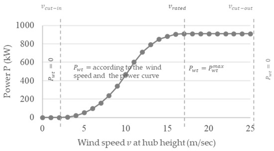 An Enercon E-44 (900 kW) wind turbine is used for the simulation and the power curve of this model is depicted in Figure 2. The power coefficient of this model ranges from 0.00 to 0.50, depending on the prevailing wind speed at the hub height, and is given by the manufacturer [48]. Τhe exploitable power of the wind turbine depends on its nominal power and on wind speed . The value in which the operation of the WT begins is the starting speed and it is 2 m/s for this model. The value in which the rated power of the machine is firstly achieved is the rated speed and here is equal to 17 m/s. Safety reasons require shutdown of the WT at very high speeds over , which in this model is equal to 25 m/s. For the power output is equal to zero. For the power output has its maximum value equal to 900 kW and for the power output is calculated according to the power curve. The 5th degree polynomial trendline obtained by the power curve for the estimation of power output (y) based on wind speed (x) is given by the following equation with an R-squared value higher than 0.99.