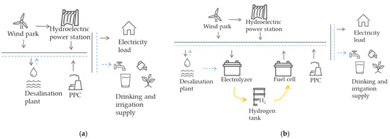 Figure 3 depicts the two different HRES depending on the storage technology. Figure 3a shows the HRES with the single PHS storage, while (b) shows the HRES with the HPHS. The grey solid line depicts the energy circulation, while the blue dashes represent the desalinated water supply. The yellow dot line illustrates the hydrogen circulation.