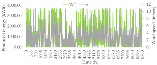 The measured wind speeds at the weather station for one year are shown in Figure 4. Estimating the wind speed to the hub height of the wind turbine with Equation (2), using the power curve of the model used in the case study and considering the total number of installed wind turbines, the total generated wind energy is shown also in Figure 4 and is proportional to the wind potential.