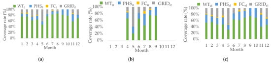 Share of energy in PHS by WT, PHS, FC and GRID for: (a) domestic water; (b) irrigation water; (c) electrical load.