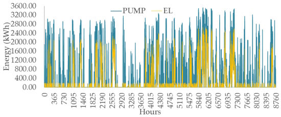 During the operation of the HRES, surplus energy is given for pumping. This energy is shown in Figure 8 for the HPHS (in hourly step), as well as the unexploited energy which remains after pumping, either because it could not be utilized by the pumps or because the upper reservoir is full, and no more water can be stored. This unexploited energy is sent to the electrolyzer (EL) to be converted into hydrogen. This amount is also used for the corresponding amount, which is required for the desalination of seawater in order to be used for electrolysis. The yellow line depicting the energy utilized by the electrolyzer in the HPHS model represents energy that ends up in a dump in the single storage.