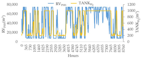 Figure 9 presents the hourly storage level of both the upper reservoir and the hydrogen tank for the HPHS model. It is shown that every time the upper reservoir reaches its minimum level, the hydrogen tank starts to discharge, providing hydrogen to the fuel cell for energy production. For periods in which the upper reservoir never reaches its minimum level, such as from about 5840 to 7300 h of the year, no change is observed in the hydrogen tank. When both the upper reservoir and the hydrogen tank reach the minimum level, the uncovered demands are fulfilled by the grid.