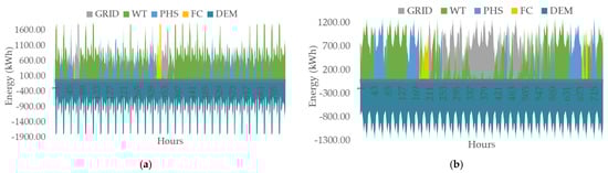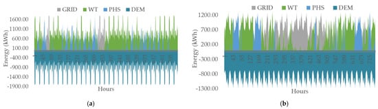 The share of energy for the PHS and HPHS is depicted in Figure 10 and Figure 11. August is presented in (a) and December in (b). The demand (DEM) is displayed with negative prices in order for the comparison to be obvious. The selection of the specific months is made based on the demands. December presents the higher demands in electricity, while August presents the higher demands in desalinated water for domestic and irrigation use. The pattern of increased values appearing in August, Figure 10a and Figure 11a, are due to the irrigation water that is considered to be required after midnight, as watering is applied after sunset. During the night, the other demands (domestic water and electricity) are much lower. Comparing both figures, it seems that in the HPHS, some periods when the grid would otherwise operate are now replaced by the operation of the fuel cell. Moreover, the hybrid storage model offers more days of autonomy compared to the single storage. Additionally, the fuel cell seems to operate more in December, compared to August. This may be explained by the fact that although in December, the total required energy demands are more, compared to August, at the same time, the wind potential, as shown in Figure 4, is higher, resulting in more unexploited energy being driven and utilized in the electrolyzer. Additionally, in December, more use of the grid is observed, compared to August, since more energy demands arise. Additionally, as it is explained previously, irrigation water demands are shifted separately to the night hours, where the rest of the energy demands are minimized, ceding by this way to the HRES the ability to cover separately these demands and provide more energy for the rest at the remaining hours of the day, based on the wind potential.