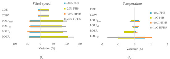 In Figure 13a, the effect of wind speed is presented. A decrease in the wind speed affects the COE and the COW more intensively than the corresponding increase. Concerning LOLP indices, they are more affected in HPHS than in HPS, probably due to the additional hydrogen storage unit. An increase in wind potential reduces LOLP further in the hybrid model, as this additional storage system can utilize the additional wind energy produced. The reduction in wind potential leads to a larger increase in LOLP in HPHS, despite the fact that the additional storage unit could cover the potential reduction in demand coverage. Obviously, hydrogen storage is not able to cover this 20% reduction in wind potential.