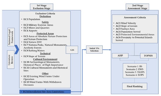 The methodological framework depicted in Figure 1 was applied to determine the most appropriate UIs in the region of the South Aegean, Greece, for the deployment of wind farm projects. The framework combines the use of GIS and MCDM methods (AHP and TOPSIS) and is divided into two distinct stages. The first stage (the exclusion stage) attempts to exclude UIs that are unsuitable for wind farm siting and, as a result, to identify eligible UIs that will be evaluated further in the second stage (the assessment stage). Individual thematic maps depicting various exclusion criteria such as the definition of UIs, safety, protected areas, the cultural environment, and others were created for this purpose using a GIS database. Inappropriate UIs were defined by overlapping the abovementioned maps, whereas the other UIs represent areas where wind farms could be deployed and are further evaluated in the second stage. AHP is applied in the second stage of the proposed methodology (the assessment stage) to determine the relative weights of six assessment criteria (AC1–AC6). Pairwise comparisons of the AC were performed based on: (i) the baseline scenario according to authors’ expertise (Scenario 1: BS), (ii) equal criterion weights (Scenario 2: EWS), (iii) a technical–economic-oriented policy scenario (Scenario 3: TEOPS), and (iv) an environmentally oriented policy scenario (Scenario 4: EOPS). The eligible UIs from the first stage are assessed and ranked using the TOPSIS method, and the most appropriate uninhabited island for wind farm siting in the region of South Aegean (Greece) is finally selected under the four different scenarios.