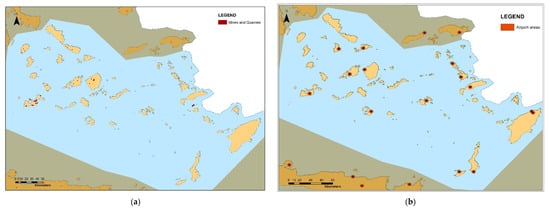 By overlapping the thematic maps related to restrictions presented in Table 1, the feasible and infeasible UIs in the region of the South Aegean for the development of wind farm projects can be determined. The thematic maps of selected exclusion criteria, related to mines and quarries (EC3), airports (EC4), Natura 2000 (EC6), and bathing waters (EC8) are shown in Figure 3.
