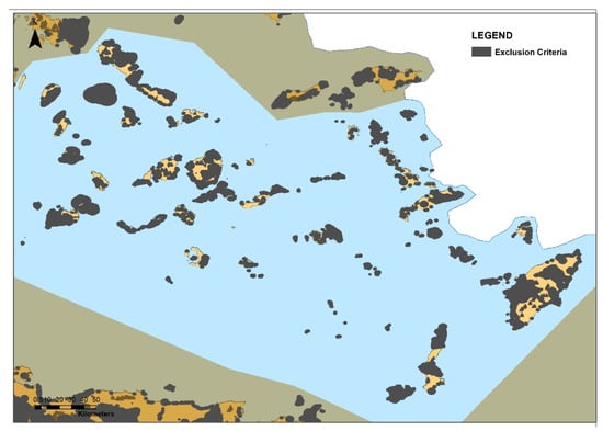 Although there is a vast body of literature on wind farm siting in insular areas, to the best of the authors’ knowledge, this is the first attempt at wind farm siting in uninhabited islets (UIs) and extends the existing literature on onshore and offshore wind farm siting, since the sitting process for UIs could take advantage of the experience and expertise on onshore wind farms on the one hand and, on the other, could exploit the advantages of offshore wind farms such as the consistent wind flow of insular areas, the mitigation of potential land use conflicts, and the elimination of noise produced that could affect nearby communities []. The property status of the study area was also examined for the first time in renewable energy siting studies; therefore, all rocky islets that are private were excluded from the analysis. Since there is a gap in the siting criteria in this spatial category (uninhabited islets), a set of criteria is proposed and applied, covering various aspects (e.g., environmental, technical, and safety) in both the exclusion and assessment phases. It should be noted that the specific focus is on the natural and the cultural environment. The exploitation of UIs for the deployment of renewable energy sources could serve as an asset for decision and policymakers.