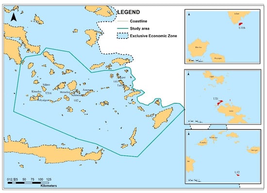 According to the Fourth Intergovernmental Panel on Climate Change (IPCC), the region of the South Aegean is among the areas that have been characterized as vulnerable to climate change []. According to the latest census of the statistical service of Greece (2011), the South Aegean area consists of 13 regional units and 33 municipalities, while the permanent population of the South Aegean comprises almost 309,015 permanent residents []. Εach regional unit and each municipality consists of inhabited islands and uninhabited rocky islets. Most of the inhabited islands share the same geological and cultural characteristics, but in terms of topography, local customs, and tourist development, each island has its own individual character. The tertiary sector is the most productive sector of the region, due to tourism, while other industries that exist in the marine area of the study area include navigation, aquaculture, and fisheries.