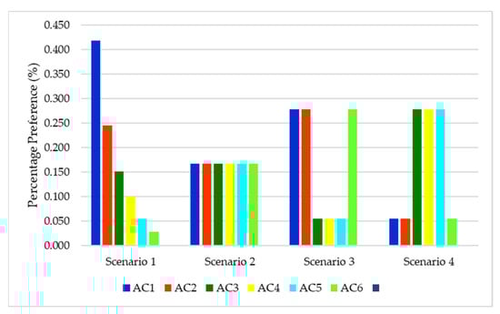 The relevant weights of each AC under the four different scenarios are presented in Figure 6. The relative weights of AC1 obtained the highest values in Scenario 1 and Scenario 3, indicating that the WV was the most important assessment criterion. This result is in line with the findings of other studies in the literature (e.g., [,,,]). Although the SoT has been neglected in several studies so far (e.g., [,]), in our study, the relative weights of AC2 received high values in Scenario 1 and Scenario 3, as it can significantly affect the cost of construction. In Scenario 4, which focuses on environmental criteria, priority is given to AC3, AC4, and AC5. The SA and PS are related to the amount of energy produced and consumed from renewable energy sources, leading to lower CO2 emissions, while PEA ensures the minimum impact of wind farm projects on the environment.