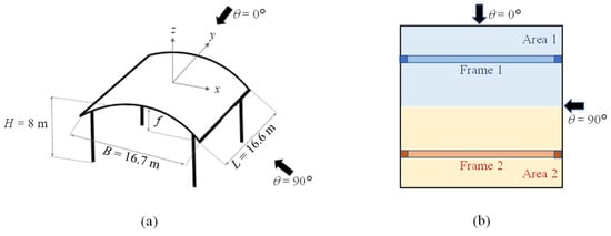 The present study considers a vaulted free roof, as shown in Figure 2a, which has a square plan of 16.7 m (B) 16.7 m (L). The rise/span ratio (f/B) is 0.1, which is a representative value for practical structures. Note that a survey of practical structures constructed in Japan indicated that the values of f/B were generally in a range from 0.1 to 0.2 and many of them were around 0.1. The mean roof height H is 8 m, which is the same as that of our previous studies [,]. We assume that the roof is supported by two steel rigid frames as shown in Figure 2b and that the wind load on each half of the roof (Area 1 or 2) is supported by each frame (Frame 1 or 2). Because the frame is a statically indeterminate structure, it is necessary to determine the sections of the members for computing the stresses induced in the members (load effects). The columns (square steel tubes) and the beam (H-section steel) are rigidly jointed, and the column base is fixed to the ground. The dimensions of the members were determined by using a conventional allowable stress design method. The design wind loads were provided by the mean wind loads for a design wind speed (= 28.6 m/s) at the mean roof height H multiplied by a gust effect factor . The value of was calculated following the procedure specified in the Building Standard Law of Japan assuming that the ‘reference wind speed’ V0 was 36 m/s. The mean wind load was provided by the product of the velocity pressure qH (= , where ρ is air density) and the mean wind force coefficient , obtained from the wind tunnel experiment. The gust effect factor is also specified in the Building Standard Law of Japan, which is 2.5 for Terrain Category III (suburban exposure). The dimensions of the members determined were as follows: