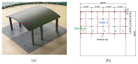 Figure 3a shows the wind tunnel model used in this study. The geometric scale is λL = 1/100. The model has six square columns of 7 mm width. Note that these columns do not reproduce the practical columns. The roof comprises a sandwich structure with a thickness of 4 mm. Each of the top and bottom surfaces has twenty pressure taps (0.6 mm ID) arranged in a half area (Area 1), as shown in Figure 3b. Each pressure tap is connected to a pressure transducer (Wind Engineering Institute, MAPS-02) using a tubing that consists of a copper pipe (0.6 mm ID) and a flexible vinyl tube (1 mm ID); the total length of the tubing is 1 m. Six columns are necessary to lead forty copper pipes to the underside of the wind tunnel. It is expected that the columns affect the flow around the roof and the resultant pressure distribution on the roof only slightly, because the width is 7 mm, as will be shown in the next section.