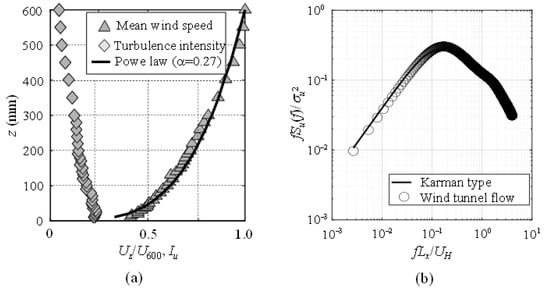 Characteristics of wind tunnel flow: (a) Profiles of mean wind speed and turbulence intensity ; (b) non-dimensional power spectrum of fluctuating wind speed at a height of z = 10 cm.
