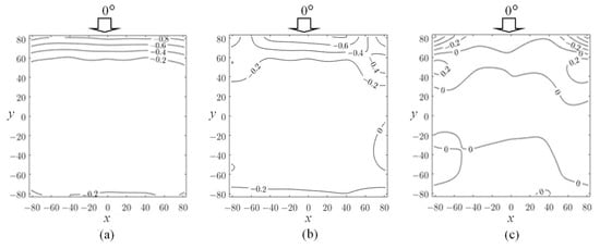 Contours of mean wind pressure and force coefficients at θ = 0°: (a) , (b) , (c) .