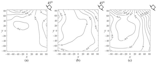 Contours of mean wind pressure and force coefficients at θ = 45°: (a) , (b) , (c) .