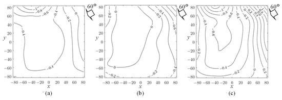 Contours of mean wind pressure and force coefficients at θ = 60°: (a) , (b) , (c) .