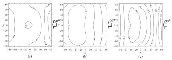 Contours of mean wind pressure and force coefficients at θ = 90°: (a) , (b) , (c) .