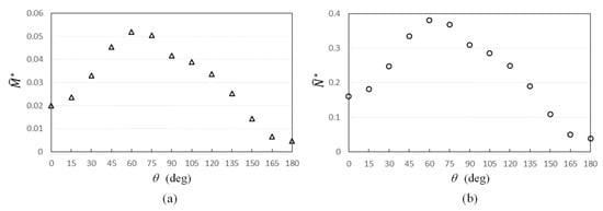The maximum peak values of and , denoted by and , respectively, during a sampling time of 600 s at full scale are directly obtained from the time histories of and . Figure 9a,b, respectively, show the variation of and with wind direction θ. As mentioned above, the pressure measurement was repeated 18 times at each wind direction. Therefore, we can obtain 18 data for each of and . The plotted value at each wind direction is the ensemble average of the 18 data. It is found that the largest values of and , denoted by and , respectively, occur at an oblique wind direction θcr (60°) not at a normal wind direction (θ = 90°). This is probably due to high suctions caused by a conical vortex generated over the roof along the verge (see Figure 7). Hereafter, focus is on θ = 60° for discussing the design wind force coefficients.
