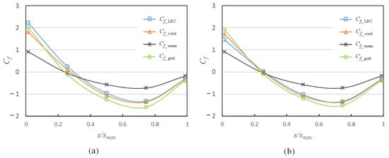 The distributions of the equivalent static wind force coefficients predicted by the above-mentioned three methods are shown in Figure 10; focus is on and in Figure 10a,b, respectively. In the figures, the distribution of the mean wind force coefficients, represented by , is also presented for reference. The abscissa of the figure is the distance s from the windward edge of the roof along the circular arc, normalized by its maximum value, . It is found that the distributions of is consistent with those of . This seems natural judging from the principle of the LRC method. The difference between and may be due to the limited number of samples. It is interesting that the distribution is also similar to the distribution, although the magnitude of is somewhat larger than that of . Comparing the values of load effects predicted by the and distributions with each other, we found that the ratio was 1.25 for the bending moment M and 1.34 for the axial force N. That is, the gust effect factor approach overestimates the load effects by about 30%. If such an overestimation is acceptable, the gust effect factor approach can be used effectively, because it is a very simple procedure requiring only the time-averaged wind force coefficients.