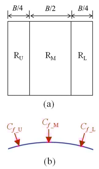 We can use the distribution as it is in the structural design. However, a simple model of wind force coefficient may be more useful in practical design. The simplest model may be as follows. That is, the roof is divided into three zones, RU, RM and RL, and constant values of , denoted by , and , are provided to these three areas, as shown in Figure 11. The zoning is the same as that for cylindrical roofs of enclosed buildings in the AIJ Recommendations for Loads on Buildings []. The values of , and are provided, respectively, by integrating over the three zones, Ra, Rb and Rc. The area-averaged values of these wind force coefficients are shown in Table 1. Then, the effect of area-evraging of on the load effects (M and N) is examined by comparing the predicted values of and from the , and values in Table 1 and those from the practical distributions shown in Figure 10a,b. It is found that the ratio is 1.08 for and 1.04 for . That is, a model of distribution represented by , and overestimates the load effects just a little bit. In other words, this model can be used for practical design reasonably.