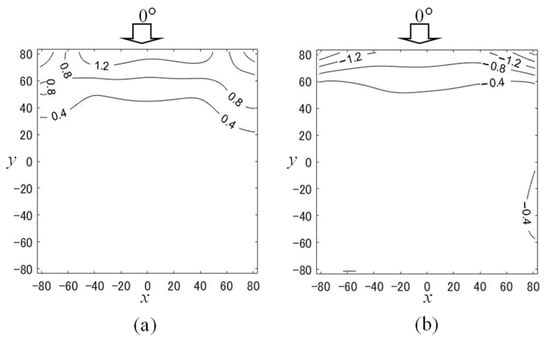 Because the subjected area of cladding is generally small, the values of and are usually specified based on the most critical maximum and minimum peak values of area-averaged wind force coefficients over the subjected area irrespective of wind direction []. The values of and generally decrease in magnitude with an increase in . In this study, however, because the number of pressure taps is rather limited, we cannot discuss the effect of subjected area on and in detail. Therefore, we focus on the most critical maximum and minimum wind force coefficients, and , among all wind directions, which were obtained at each point.