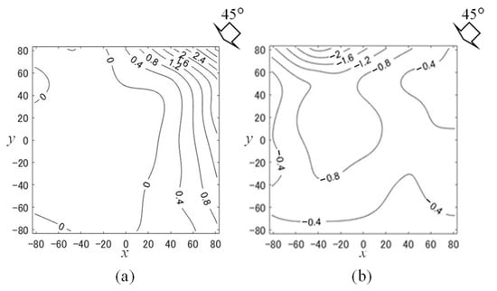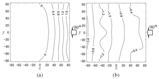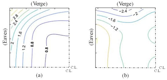 The contours of the most critical maximum and minimum peak wind force coefficients among all wind directions, and are shown in Figure 16. In the figure, the results for only a quarter area of the roof are illustrated, considering the symmetry of the roof. It is clear that the values of are rather large near the corner and in strip areas along the eaves and verge. The magnitude of is generally large along the verge. These features are similar to those observed for planar free roofs [].