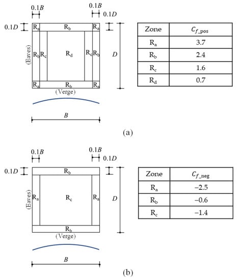Based on the results of Figure 16, we have proposed the positive and negative peak wind force coefficients, and , for the design of cladding of the vaulted free roof under consideration. The results are shown in Figure 17. The roof is divided into several zones, Ra–Rd for and Ra–Rc for , and the values of and are determined based on the maximum and minimum values of and in each zone. The values correspond to a tributary area of = 1 m2, as mentioned above. The zoning is determined in reference to that for gable roofs [] and that for cylindrical roof of enclosed buildings [].