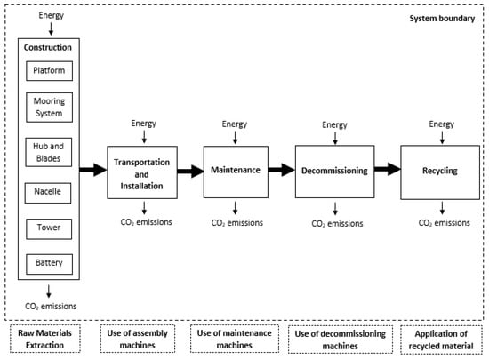 Therefore, we performed a Life Cycle Analysis that addresses different stages of the process analyzed in this study. The objective was to show the environmental impacts generated on a large scale through a balance of energy consumption and CO2 emissions. This analysis was made through accounting the CO2 emissions generated from the turbine components (data obtained from manufacturers catalogs), its location and processes involved, and databases with information from used materials and sources on how the processes involved take place, which will be better explored in the following sections. The system with its boundaries, inputs and outputs, are represented in Figure 1.
