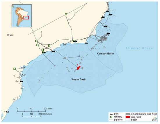 Location of the Campos and Santos basins. Source: eia.gov (accessed on 3 April 2021).