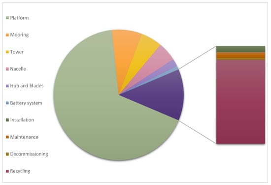 The system attached to the turbine, consisting of the battery and container, has a low impact, of around 1%. The life cycle stages of the installation, maintenance and decommissioning cause very low impacts when compared to the construction of the components. The recycling stage after the end of the turbine lifetime constitutes about 11% of all contributions, and this value is significant when compared to other stages, being the second largest followed by the production of the platform, as it represents the reuse of all the materials that make up the turbine (with the exception of copper) and the entire platform.