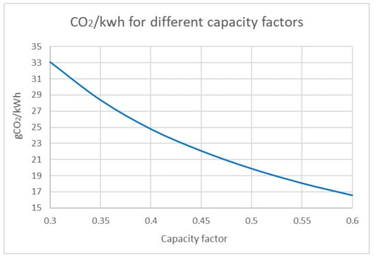We can see that the behavior of CO2 emissions per kWh and EPT values follow a decreasing relationship, and the behavior of EPR follows an increasing relationship exactly linear. It is notable that even for the minimum value of capacity factor analyzed, the project is advantageous from an energy point of view, and emissions would still be much lower than the commonly used alternative, which uses fossil fuel, which is analyzed in the next subsection.