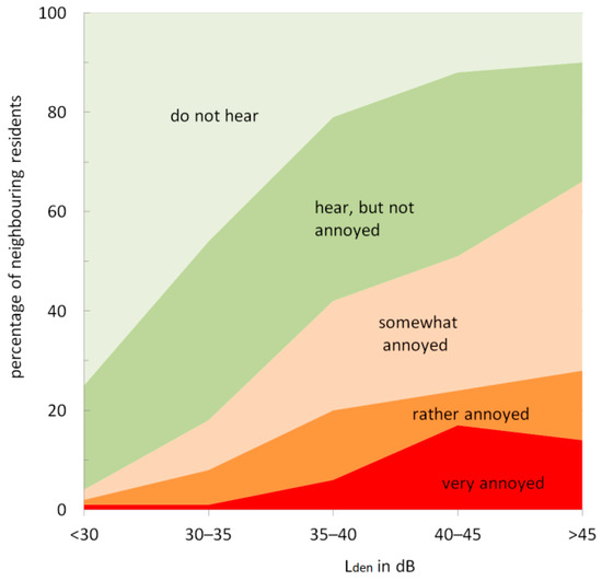 From this, it can be inferred that reduction in the impact of environmental sound can be reached in different ways. One way is to reduce the impact of sound is either by reducing sound level or by reducing annoying characteristics of the sound (such as tonal content) or other exposures from the same source. The usual approach is to set a sound level limit to prevent residents from being exposed to unacceptable high sound levels. A limit is usually based on an acceptable level of annoyance and may be derived from sources with more or less similar effects or exposures. A procedure to derive a limit by comparison with other sources is described by Fredianelli et al. [76]. Others, such as the WHO [48] and Davy et al. [77], have proposed limits based on an acceptable prevalence of annoyance. In these cases, the character of sound can be included or implied in the limit, but there is no bonus for an operator who tries to minimizee annoying characteristics. In addition, a certain prevalence of annoyance (and possible other effects) is taken for granted and other ways to reduce annoyance are not taken into account.