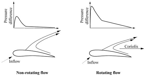 Stall delay is a boundary layer phenomenon that is primarily assumed to be attributable to centrifugal force, a dynamic pressure gradient, or a blend of both. Either or both of these responses stimulate spanwise flow, leading to formation of the Coriolis force [,,,,,,,,,,,,], as shown in Figure 2. The Coriolis force acts from the leading edge to the trailing edge as a positive chord-wise pressure gradient, ensuing in stall delay, as shown in Figure 3. Figure 3 illustrates this phenomenon, where the pressure difference between the aerofoil’s suction side and pressure side is higher for a rotating flow than for a non-rotating flow due to the presence of Coriolis force, which increases the lift coefficient. At low wind speeds, which implies low angles of attack, the flow stays attached on the rotor’s suction side, and no stall emerges. Even though centrifugal force and the dynamic pressure gradient are present, their effects are modest since the flow passes over the blade in a brief period of time. When flow separation occurs at higher wind speeds (i.e., at higher angles of attack), a separated air mass persists along the suction surface and is subjected to centrifugal pumping and/or a dynamic pressure gradient. When spanwise flow occurs in a rotating reference frame, the Coriolis effect occurs, resulting in stall delay.