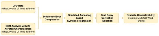 The proposed stall delay correction model determined using Pareto simulated annealing-based symbolic regression is given in Equations (11) and (12), where , , , . The choice of exploratory parameters is crucial for the symbolic regression model’s capability to capture the underlying physics; therefore, the non-dimensional exploratory parameters (see Equations (11) and (12)) considered in this study were chosen based on extensive literature review. Further, the variables (tip speed ratio) and (ratio of local chord to local radius) were selected automatically based on their capability to capture the underlying physics. The compact size of the expression and choice of operators in the expression reaffirms that the model is not overfit to the data. In addition, the obtained model is also validated on MEXICO rotor experimental results. The overall workflow of this study is shown in Figure 5.