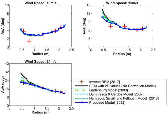 Figure 6 depicts the distribution of angles of attack over the blade length for wind speeds ranging from 7 to 25 m/s, as calculated from the BEM assessment of the NREL Phase VI turbine without and with distinct correction models for stall delay. Figure 7 presents a comparison of the distribution of angles of attack over the blade length for the MEXICO rotor at wind speeds of 10 m/s, 15 m/s, and 24 m/s. It is essential to realise that whereas correction models for stall delay alter anticipated forces on the blades, the influence on distribution of angles of attack is minimal. The sole exception is when the correction models for stall delay predict very high load variations in the area of the root. In these cases, a comparable local variation in angles of attack is created at the root, as predicted by BEM analysis with correction models for stall delay, which are close to 3D values predicted by Inverse BEM analyses, but BEM with no correction models overestimates angles of attack.