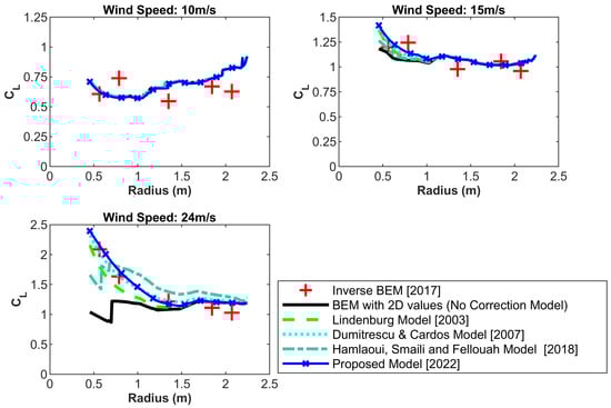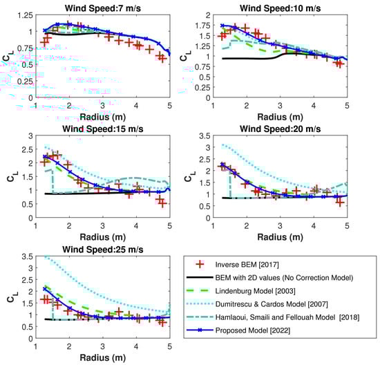 The BEM process utilises the aerofoil sections’ and values throughout the blade length. Aerofoil characteristics are typically inferred from wind tunnels or 2D CFD tests. As stated in the preceding section, stall delay enhances , notably on the inboard portions of the blade. There are numerous correction models to integrate BEM analyses to account for the impact of stall delay. The inaccuracies of various correction models for stall delay were outlined in Section 1. Breton et al. [] compared the results of the NREL Phase VI turbine to six correction models for stall delay: Snel [], Chaviaropoulos and Hansen [], Raj [], Corrigan and Schilling [], Bak [], and Lindenburg []. The models over-predicted the forces observed on a wind turbine blade throughout a variety of operating cases, while the model built by Lindenburg [] was shown to perform the best across the set of scenarios investigated but still had substantial inadequacies. Guntur et al. [] did an analogous test for the MEXICO rotor and compared it to five correction models: Snel [], Du and Selig [], Chaviarpoulus and Hansen [], Lindenburg [], and Bak []. None of the five correction models could accurately predict the 3D aerofoil characteristics [,]. Detailed assessments of the BEM analysis for the evaluation of the NREL Phase VI turbine were carried out in 2017 by Kabir and Ng []. They focused on the various extrapolation methods for the S809 aerofoil polar characteristics. They used an enhanced Inverse BEM strategy to predict and values from the full CFD rotor analysis throughout the blade length and compared their measured values with the corresponding BEM values, leveraging four different correction models for stall delay []: Snel [], Du and Selig model [], Chaviaropolous and Hansen [], and Lindenburg []. It was observed that among the four models, the Lindenburg model was closest to the lift coefficients predicted by the Inverse BEM analysis of the 3D CFD simulation of the NREL Phase VI turbine.