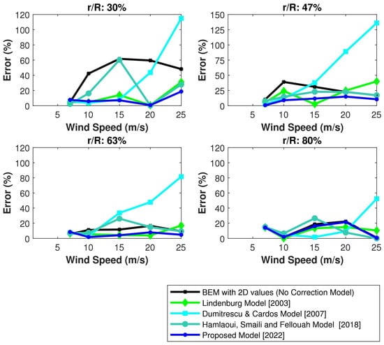 Error in computation by each model at different radial positions with different wind speeds for MEXICO rotor.