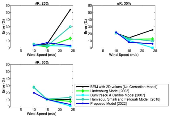 Figure 8 illustrates the contrast of the estimated value throughout the blade length by the BEM assessment without and with the different existing correction models for stall delay and the model proposed with the value obtained from the CFD analyses of the NREL Phase VI turbine for wind speeds of 7 m/s, 10 m/s, 15 m/s, 20 m/s, and 25 m/s. BEM predicts the enhancement in lift coefficient attributable to stall delay quite decently up to a wind speed of 10 m/s with all correction models for stall delay []. With increasing wind speed, BEM with previous correction models for stall delay, such as the Dumitrescu and Cardos model [,,], estimate higher values in comparison to calculation from the CFD study for the NREL Phase VI turbine []. The Lindenburg model [] substantially overpredicts at extremely high wind speed of 25 m/s, as predicted earlier by Breton et al. [] and Kabir and Ng []; however, for other wind speeds, the trajectory of increase in throughout the blade length is close to the throughout the blade length. The Hamlaoui, Smaili and Fellouah model [] for r/R < 30 percent, which is considered to be the lower inboard region of the blade, and for r/R > 50 percent, which is considered to be the top half of the blade, gives predictions comparable to the 3D values. However, the value of shows a profound downward trend for r/R between 30 percent and 50 percent, ignoring the effect of stall delay. The root cause of this tendency is that Hamlaoui et al. [] employed values from only five radial positions: 30 percent, 47 percent, 63 percent, 80 percent, and 95 percent. It is worth noting that just around 30 percent of the r/R is located in the inboard portion, where the effect of stall delay is strongest, whereas the other four radial positions are almost on the blade’s upper half. As a consequence, they incorporated two components in their correction models: r/R < 30 percent and r/R > 30 percent. However, because the second component is based on values predicted above 47 percent, this model fails to estimate the effect of stall delay between 30 and 47 percent. As a corollary, 3D values computed at additional radial positions (0.250R, 0.267R, 0.328R, 0.390R, 0.450R, 0.510R, 0.570R, 0.633R, 0.691R, and 0.750R) were also included in estimating the correction models in our work. Therefore, for all wind speeds, the current proposed model determines results close to the for the NREL Phase VI turbine. The accuracy of the proposed model is confirmed by computing the error percentage at four radial positions (0.30R, 0.47R, 0.63R, and 0.80R) considered in the experimental analysis and is presented in Figure 9. As recognised, the percentage of error calculated from the proposed method is predominantly less compared to the other models. The proposed model can only be used up to 0.8R, whereas the calculated values of at r/R > 80 percent are values without any added correction. Unlike the inboard section, in the tip region is lower than . This is due to tip vortices with the secondary flow generated at the tip [,]. The current model is only meant to take into account stall delay; therefore, the correction model is only proposed up to 0.8 R. For this reason, radial positions smaller than 0.8 R are represented in the error comparison for both the NREL Phase VI and MEXICO rotors. In the future, a new model will be proposed to account for the correction in the reduction of the lift coefficient due to the effect of tip vortices. Figure 10 depicts the distribution estimated from BEM analysis without and with correction models for stall delay along the MEXICO rotor’s blade length for three distinct wind speeds. Figure 11 shows the error comparison for prediction at three distinct radial positions (0.25R, 0.35R, and 0.60R) utilised in the experimental analysis, ignoring radial positions above 0.8R. Almost all models forecast closure values with the experimental data at wind speeds of 10 m/s and 15 m/s; however, at 24 m/s, the Dumitrescu and Cardos [,,] model and the proposed model are quite similar to 3D values obtained from the experimental data, while the Lindenburg model [] is slightly lower but follows the same trend. The Hamlaoui, Smaili and Fellouah model [], on the other hand, is a total catastrophe. As per Figure 10 and Figure 11, the proposed model outperforms the existing correction models for stall delay.